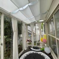 2021年5月21日 / 最終更新日時 : 2021年5月21日 藤田 雅之 現場日記 日除け取付工事 今日は、以前にガーデンルームを設置した現場で、 日除けの取付が行われました。 本体・レール共にホワイトです。