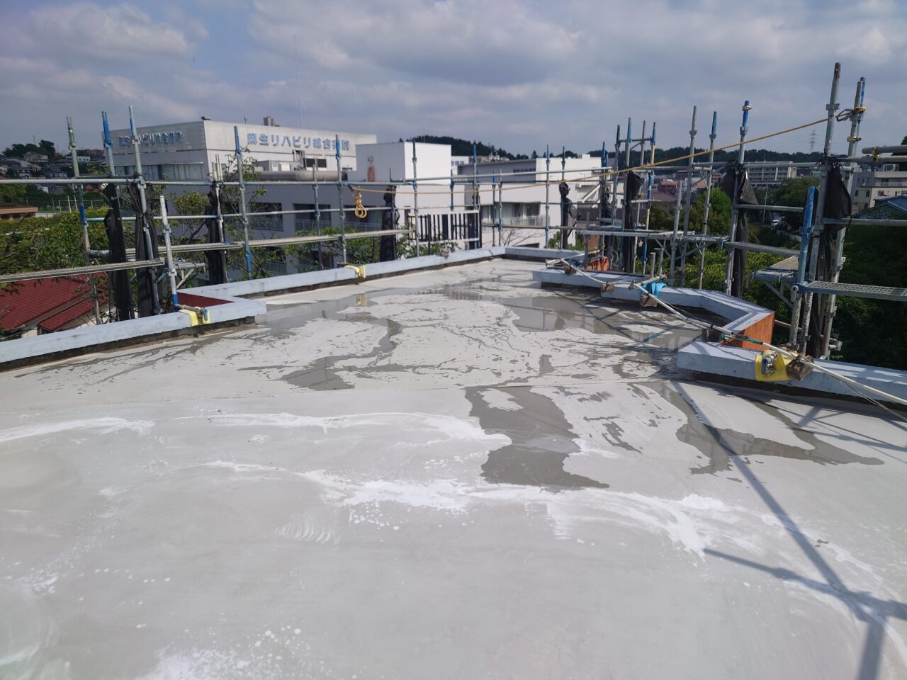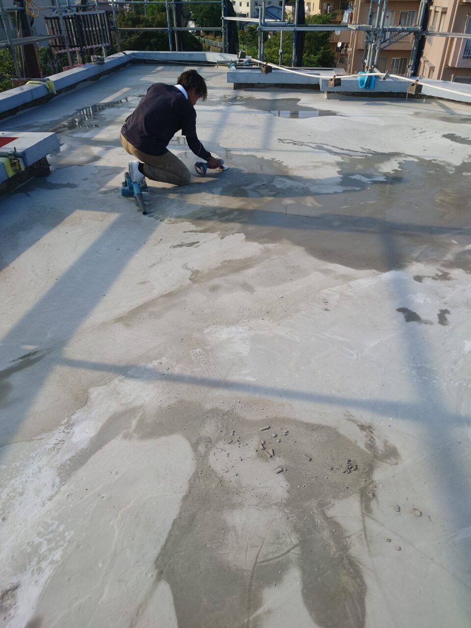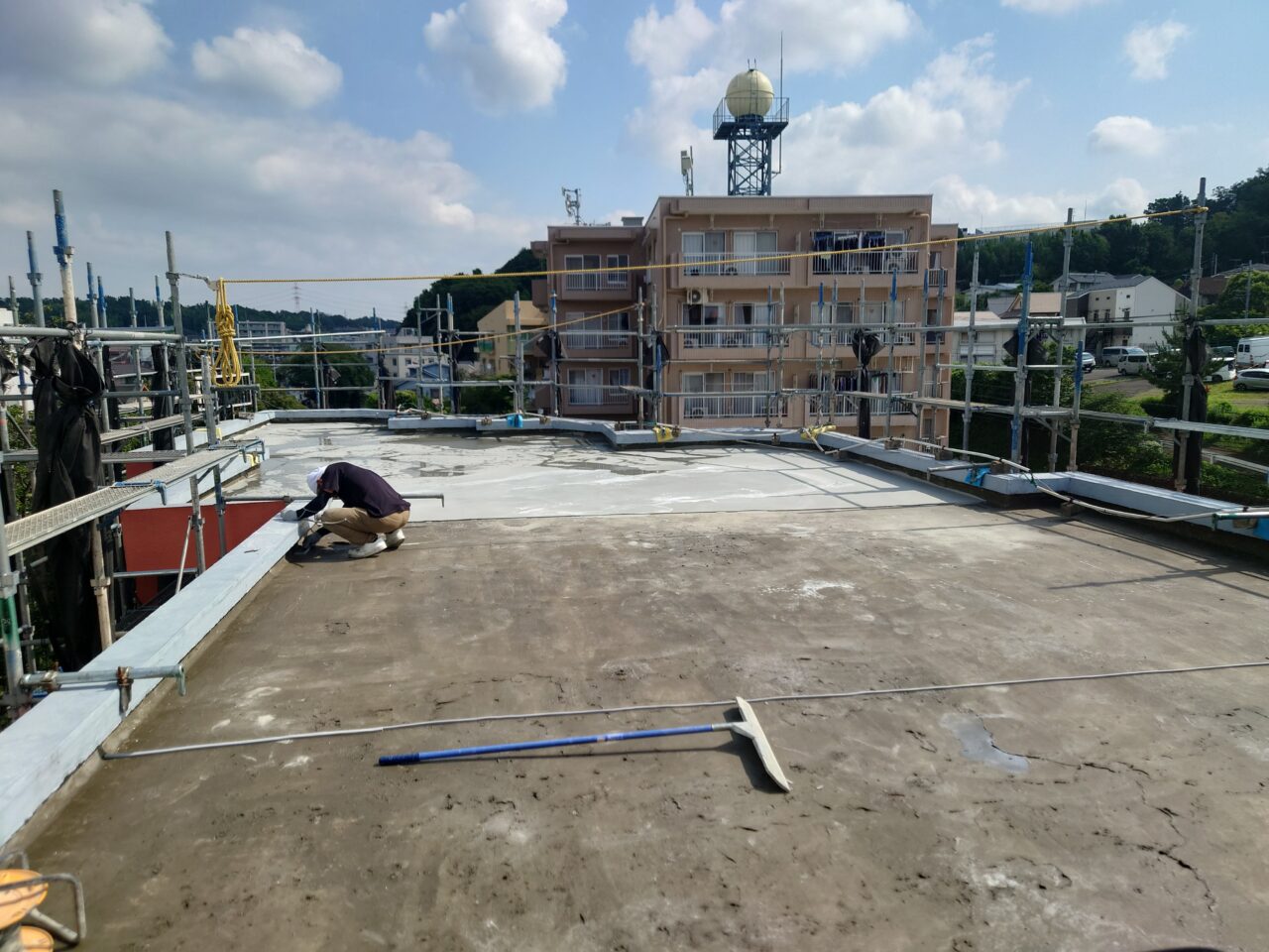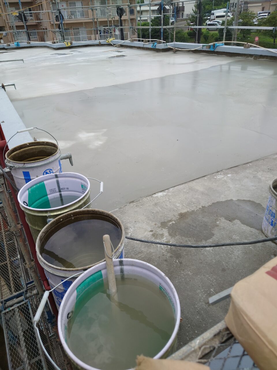 2025年6月21日 / 最終更新日時 : 2025年7月30日 藤田 雅之 現場日記 レベラー打設2日目 レベラー打設2日目です。 仕上がった箇所に散水し、勾配の調整を行います。 片勾配でクランクも多いので、完全に排水するまで時間はかかりますが、 順調に進んでいます。 FacebooktwitterHatenaPocket