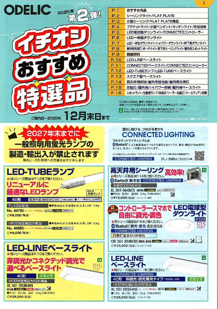 2025年10月21日 / 最終更新日時 : 2025年10月21日 藤田 雅之 お知らせ ODELIC イチオシおすすめ特選品 2025年12月末日まで、ODELICの照明器具をお安く提供できます! 2027年末までに、一般照明用蛍光ランプの製造・輸出入が禁止されます。 早めにLED照明への交換をおすすめしております。 ※セール対象製品、金額、施工費等は、弊社までお気軽にご連絡ください。 FacebooktwitterHatenaPocket