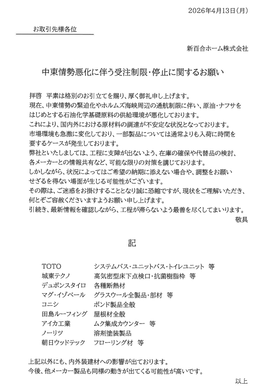 現在、中東情勢悪化の影響により、原油・ナフサをはじめとする