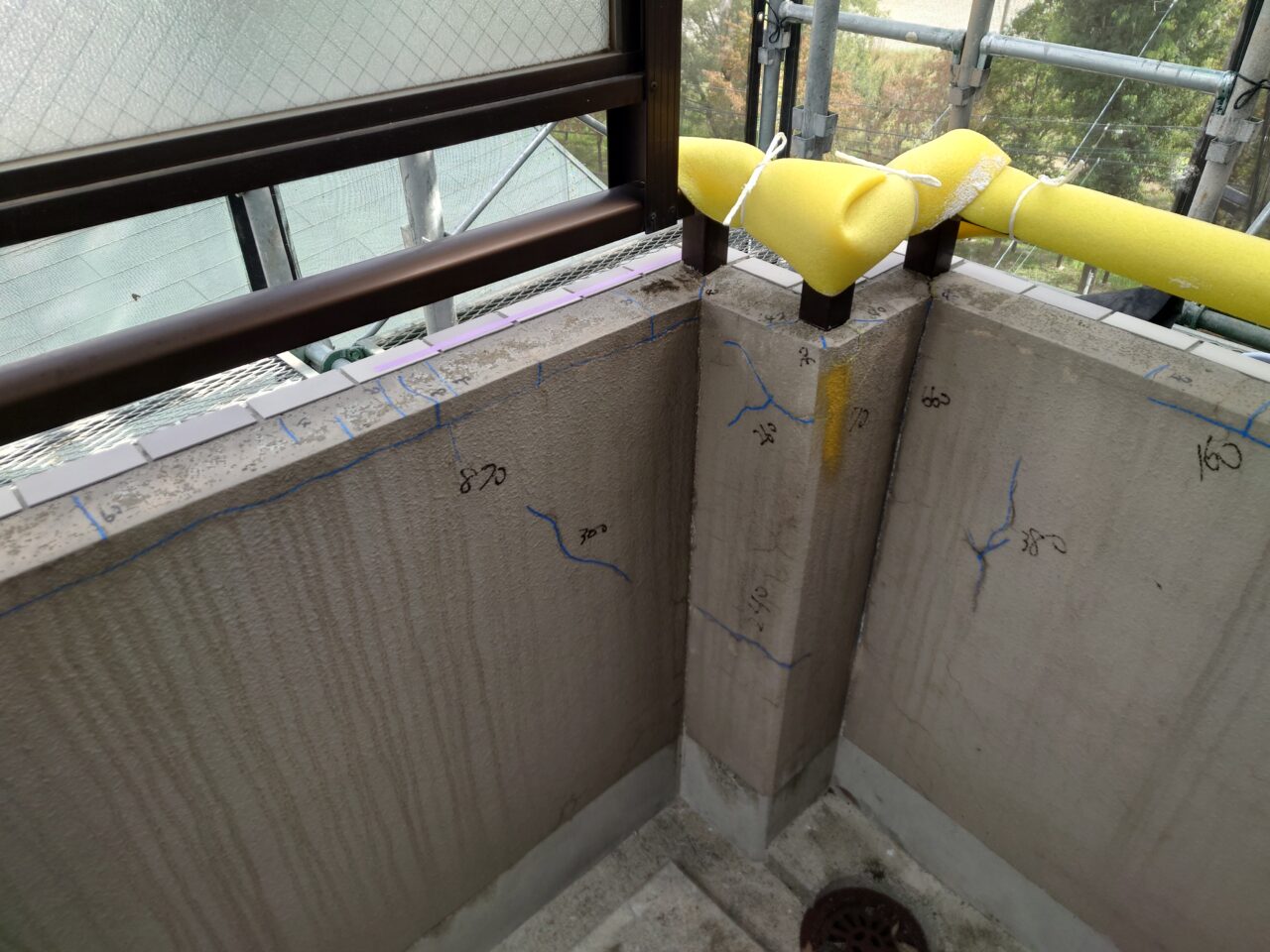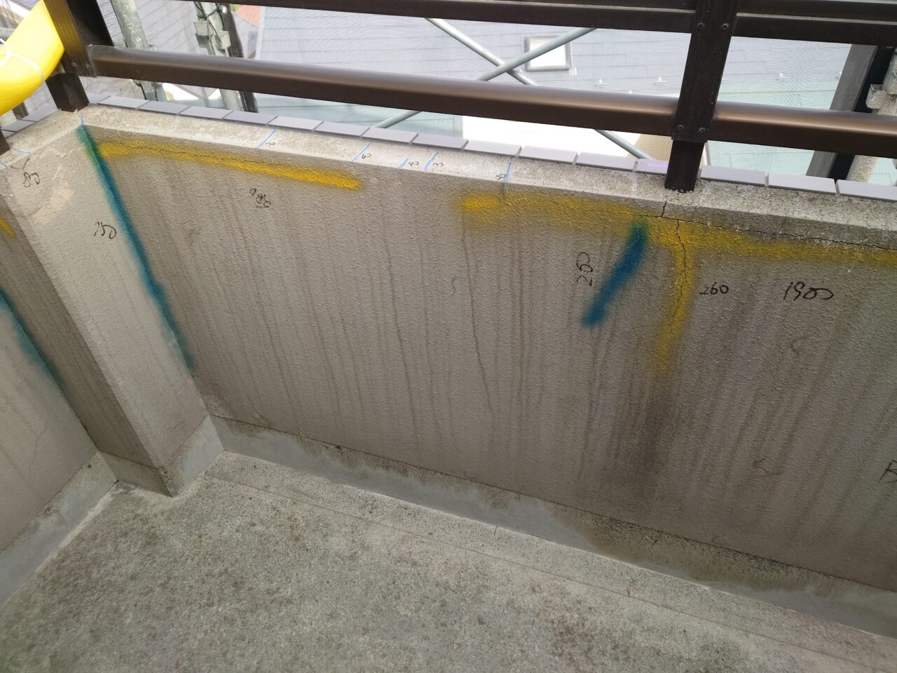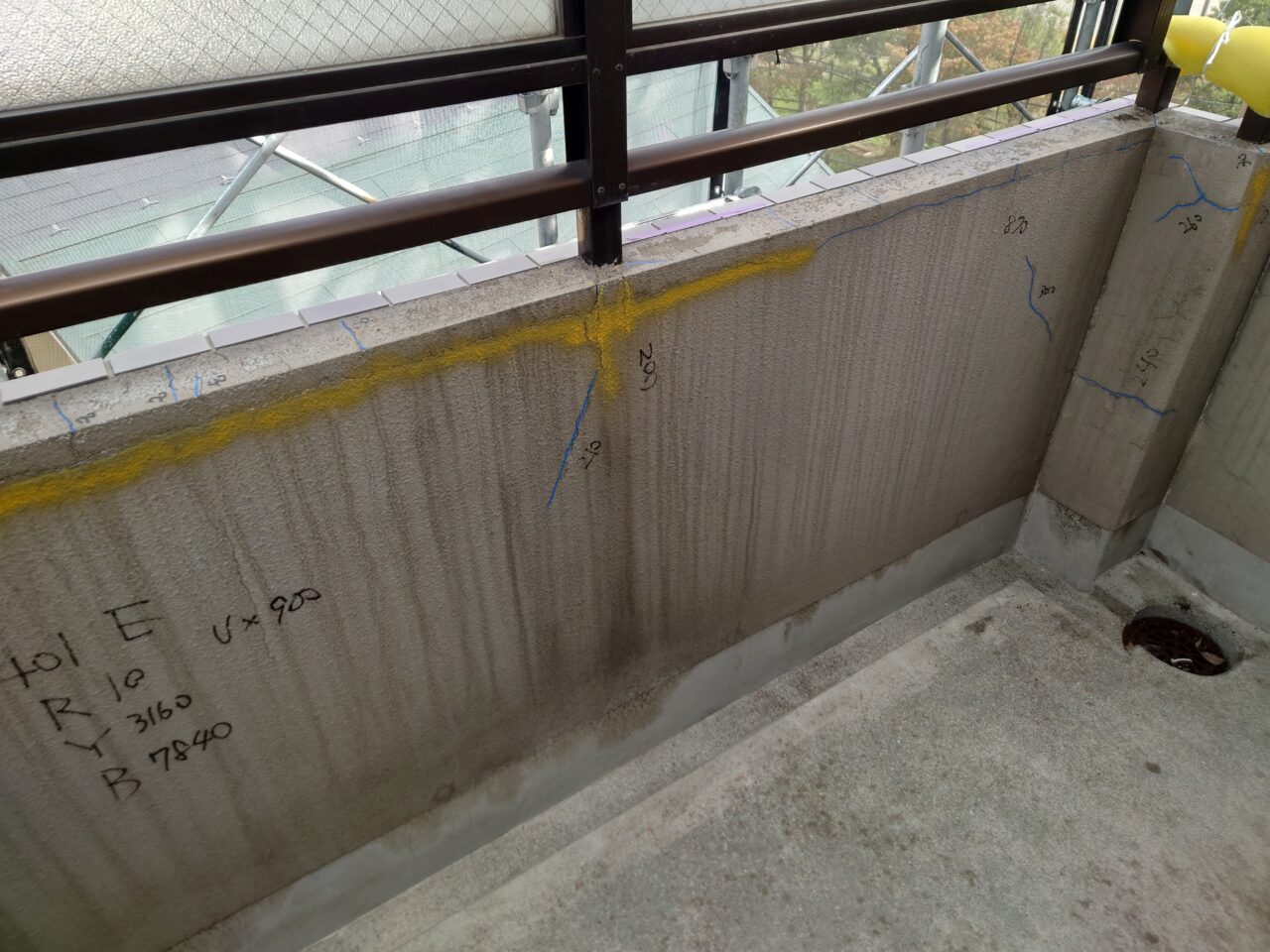 2023年10月2日 / 最終更新日時 : 2023年10月2日 藤田 雅之 現場日記 一般外壁補修 今日は、モルタル部劣化箇所の集計と確認です。 赤・・・爆裂・欠損 黄・・・0.3mm以上 構造クラック 青・・・0.3mm以下 ヘアクラック 3種類で色分けし、状況によって Uカット を追加していきます。 FacebooktwitterHatenaPocket