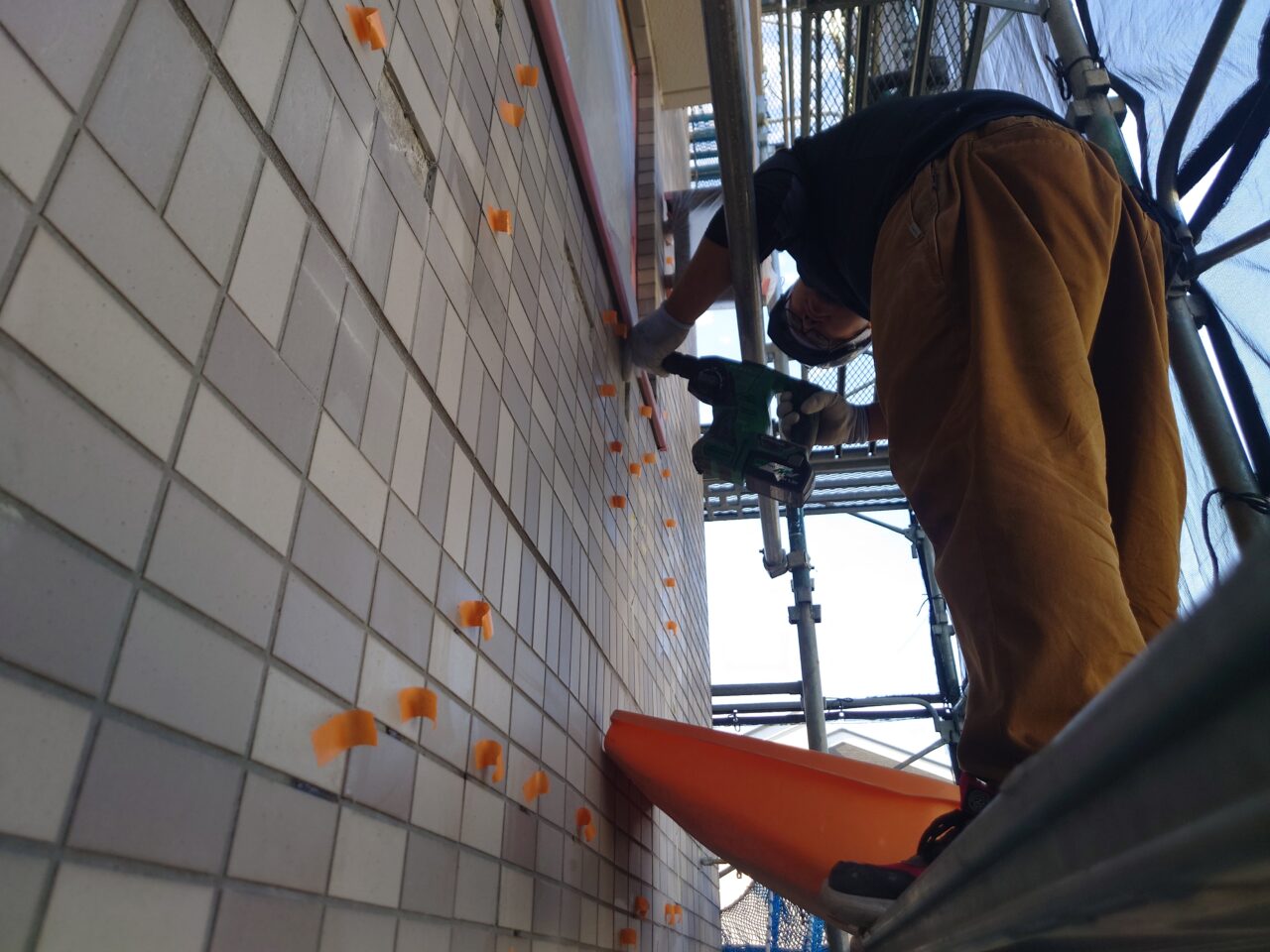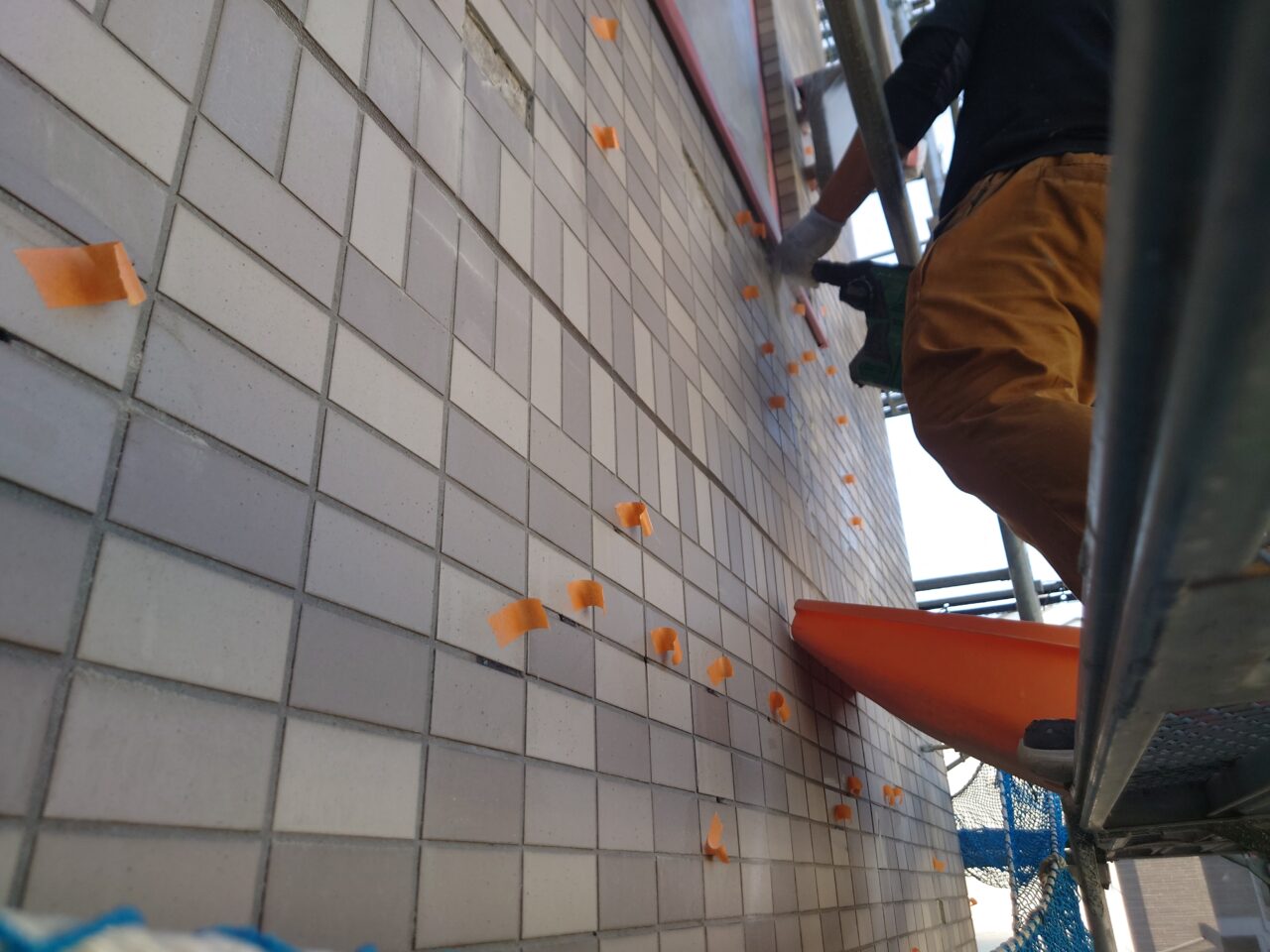 2023年11月4日 / 最終更新日時 : 2023年11月4日 藤田 雅之 現場日記 タイル斫り 今日は、外壁北面タイルの斫りです。 黄色テープが張替えで、オレンジテープはアンカーピンの目地補修箇所です。 FacebooktwitterHatenaPocket