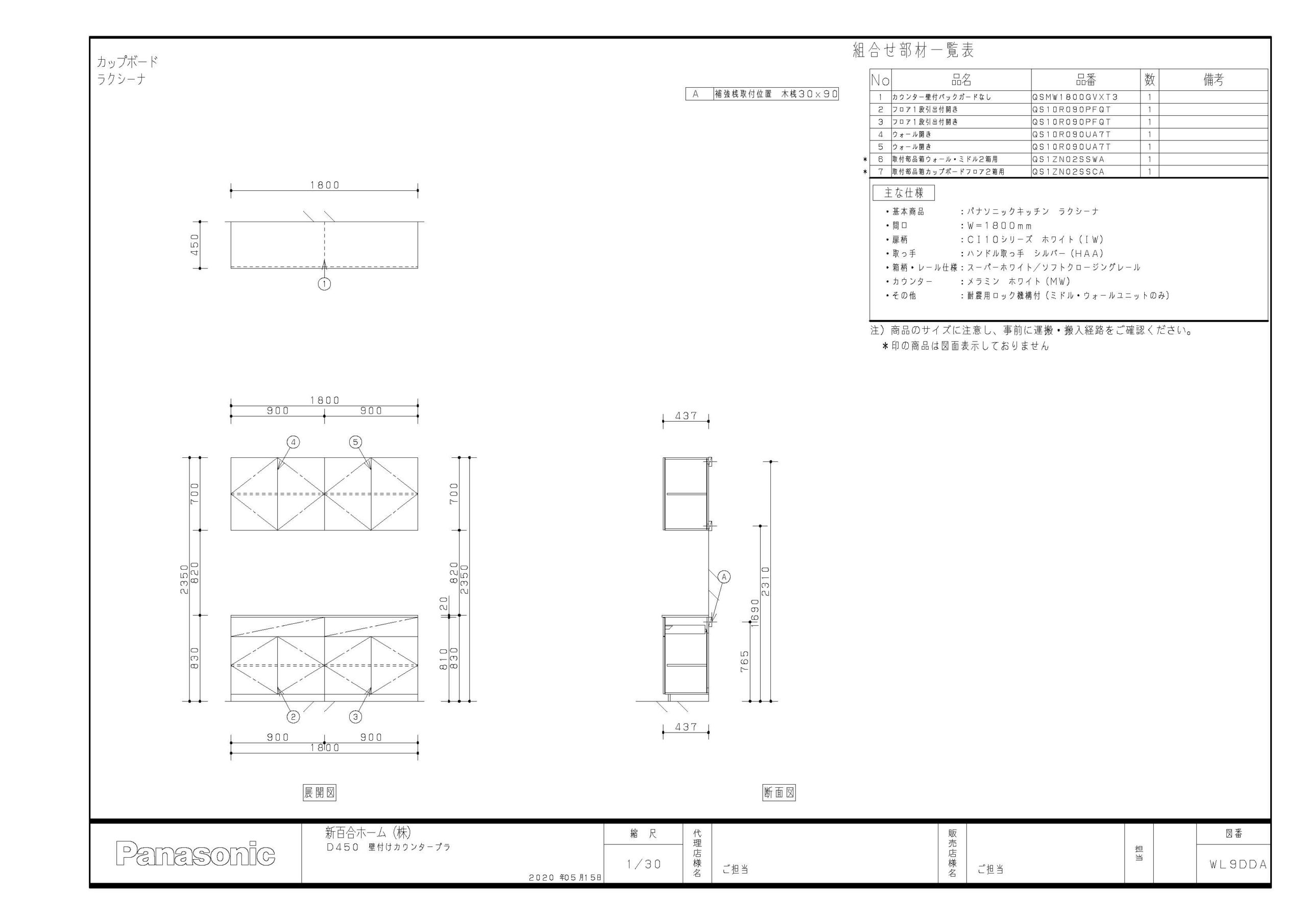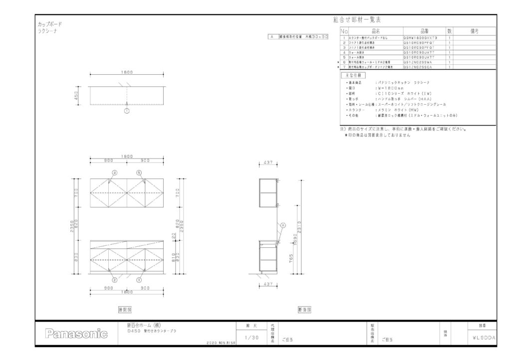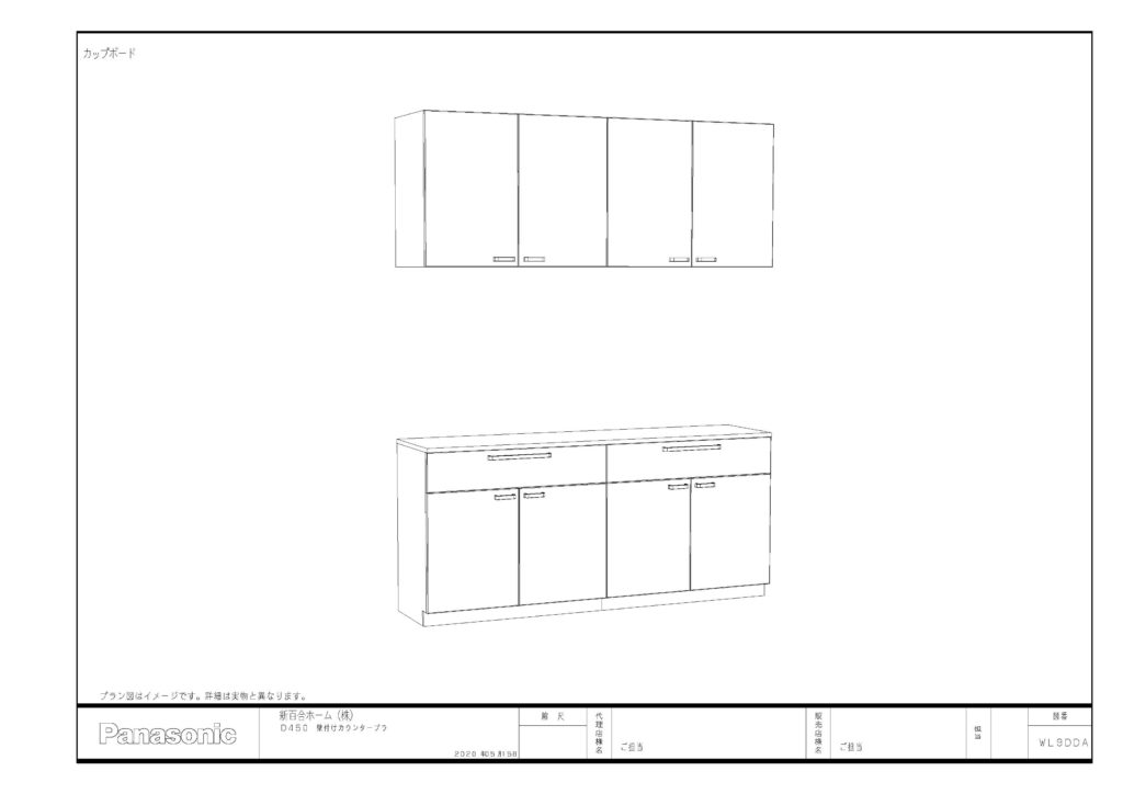 パナソニック カップボード W1800 全面カウンター上下収納タイプ設置工事