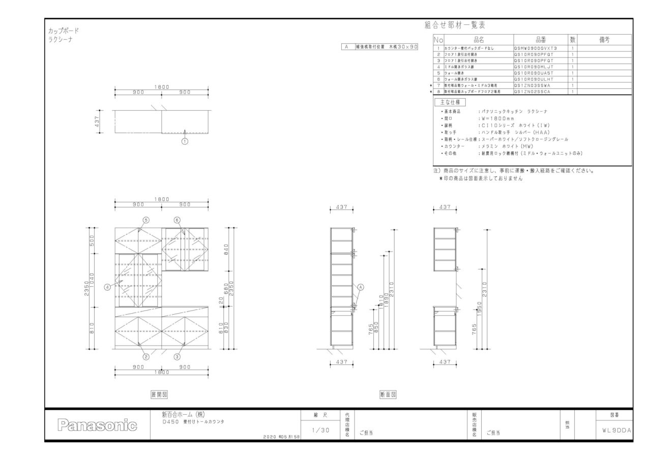 パナソニック カップボード W1800 ハーフカウンターガラス扉付き収納重視タイプ設置工事